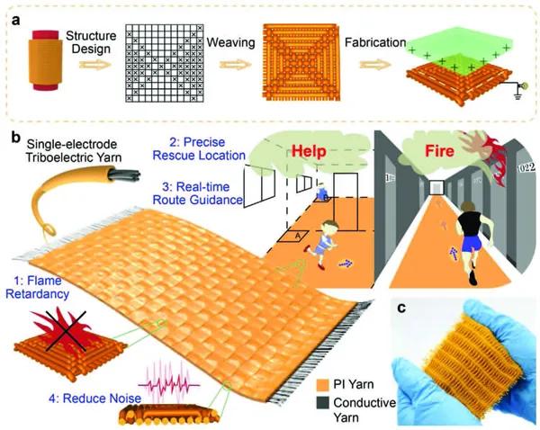 火災(zāi)事故已成為造成嚴(yán)重人身燒傷和毀滅性損失、威脅公共安全和財(cái)產(chǎn)安全的常見災(zāi)害之一。大量的火災(zāi)案例表明,提高人的逃生能力和材料的阻燃能力對減少人員傷亡具有重要意義。發(fā)生火災(zāi)時(shí),大部分的救援電子設(shè)備由于電力中斷而無法使用。因此,迫切需要具有阻燃功能的自供電消防電子設(shè)備。在這種情況下,具有機(jī)械能收集和自供電傳感能力的摩擦電納米發(fā)電機(jī)(TENG)可以解決上述問題。此外,考慮到室內(nèi)環(huán)境的裝飾及其他功能需求,即具有阻燃功能的紡織品將是制造消防救援傳感器的理想材料。裝飾用紡織品具有降噪、輕量化、透氣性、可洗性、可調(diào)性、柔性等附加功能性能。因此,與薄膜或條狀電子器件相比,裝飾用紡織品將是室內(nèi)能量采集或信號(hào)監(jiān)測的更好選擇。目前,對織物TENGs的研究已有眾多的進(jìn)展,但仍存在幾個(gè)阻礙其進(jìn)一步應(yīng)用的關(guān)鍵問題有待解決。首先,在整個(gè)織物上浸涂功能材料制造的織物摩擦納米發(fā)電機(jī)(F-TENGs),織物通常硬度高,透水性極差,嚴(yán)重影響其穿著舒適性。其次,多層結(jié)構(gòu)的F-TENGs一般都是通過復(fù)雜的工藝制備而成,導(dǎo)致器件體積龐大且剛性不足,既不利于采集人體日常小微運(yùn)動(dòng)的能量,也不適合軟性傳感和檢測的需求。因此,用連續(xù)的TENG紗線通過織機(jī)制造F-TENG,保證其透氣性、柔韌性和舒適性,是解決上述問題的關(guān)鍵。然而,最近報(bào)道的纖維(紗線)形TENG通常存在長度短、直徑大、細(xì)度不均勻等問題,不適合紡織機(jī)械加工技術(shù),直接影響織造效率和織物風(fēng)格。此外,對于F-TENG這種具有阻燃性能、降噪性能、透氣性等特殊功能的產(chǎn)品,目前還缺乏研究。因此,通過對紡紗工藝的控制以獲得細(xì)度均勻、細(xì)度細(xì)的紗線,以及織物結(jié)構(gòu)的設(shè)計(jì)及織造等均對功能性F-TENG的生產(chǎn)具有十分重要的意義。近日,在新疆大學(xué)青年教師馬麗蕓,中科院北京納米能源與系統(tǒng)研究所王中林院士,東華大學(xué)汪軍教授和廈門大學(xué)郭文熹副教授團(tuán)隊(duì)等合作,開發(fā)了一種基于阻燃包纏紗的3D蜂巢結(jié)構(gòu)機(jī)織摩擦電納米發(fā)電機(jī)(F-TENG)。該包纏紗采用連續(xù)空心錠花式捻線技術(shù),與傳統(tǒng)的紡織生產(chǎn)工藝兼容。由此制備的3D F-TENG可作為自供電的逃生和救援系統(tǒng),應(yīng)用于智能地毯,可精準(zhǔn)定位幸存者位置并指出逃生路線,及時(shí)協(xié)助受害者搜救。作為室內(nèi)裝飾,獨(dú)特的蜂巢織造結(jié)構(gòu)設(shè)計(jì)賦予了F-TENG織物優(yōu)秀的降噪能力。此外,結(jié)合其良好的機(jī)洗性、透氣性、阻燃性、耐用性、重復(fù)性等特點(diǎn),3D F-TENG在消防救援、可穿戴傳感器以及智能家居裝飾等方面都有很大的應(yīng)用潛力該成果以題為“A Machine-Fabricated 3D Honeycomb-Structured Flame-Retardant Triboelectric Fabric for Fire Escape and Rescue”發(fā)表在了Adv. Mater.上。