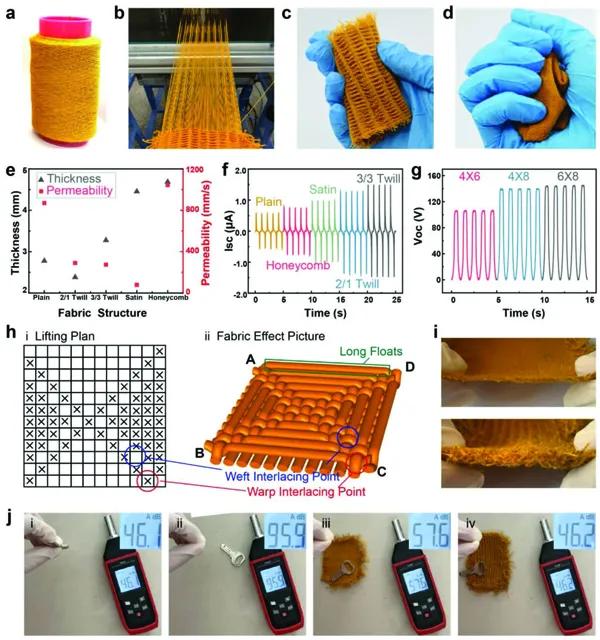 e)不同結(jié)構(gòu)的F-TENGs的透氣性和厚度。f)不同結(jié)構(gòu)的F-TENGs的短路電流。i)3D F-TENG和普通F-TENG厚度的比較。j)3D F-TENG和普通F-TENG降噪的比較。