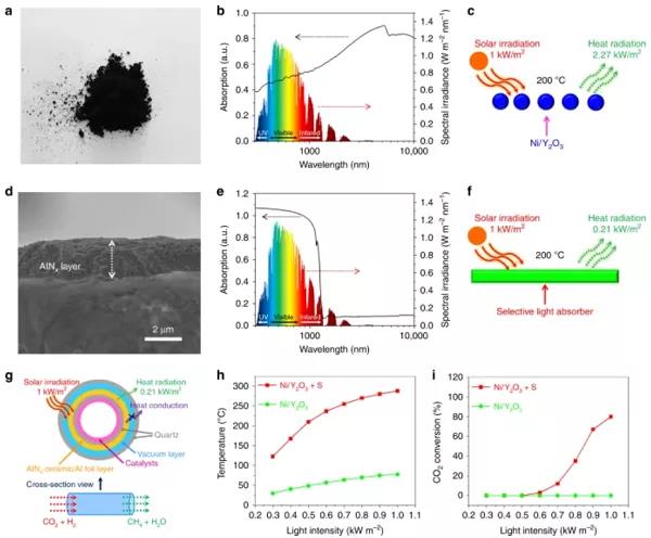 河北大學(xué)的李亞光、王淑芳和浙江師范大學(xué)的胡勇、日本國立物質(zhì)材料研究所葉金花(共同通訊作者)得益于添加可以同時吸收太陽光全譜和產(chǎn)生熱輻射的選擇性光吸收劑,制造了新型光熱轉(zhuǎn)換器件,可以吸收95%的太陽光,熱輻射僅為報道吸光材料的1/10,能夠在標(biāo)準(zhǔn)太陽光輻照下產(chǎn)生288 °C的高溫,是傳統(tǒng)吸光材料的三倍以上,可實現(xiàn)標(biāo)準(zhǔn)太陽光驅(qū)動下的二氧化碳甲烷化光熱化。不僅如此,他們還制備了負(fù)載單原子鎳的非晶Y2O3二維納米片,作為高效甲烷化催化劑。在選擇性吸光劑光熱器件和負(fù)載型非晶Y2O3二維納米片的協(xié)同作用下,實現(xiàn)了室外太陽光(0.52到0.7個標(biāo)準(zhǔn)太陽光強度)輻照的高效二氧化碳甲烷化,其轉(zhuǎn)化效率和甲烷產(chǎn)率可分別達(dá)到80%和7.5 l m?2 h?1。
