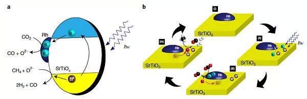 近期,日本高知工科大學(xué)的Takeshi Fujita、國立材料科學(xué)研究所的Hideki Abe和東京工業(yè)大學(xué)的Masahiro Miyauchi(共同通訊作者)等人報告了一種SrTiO3支撐的銠(Rh/STO)催化劑,可在無熱源低溫條件下、通過紫外光輻照有效提升甲烷重整,從而實現(xiàn)典型熱催化無法實現(xiàn)的功能。研究顯示,光激發(fā)空穴和電子可分別用于STO上的甲烷氧化和銠上的二氧化碳還原。同位素分析則清楚地表明晶格氧(O2?)扮演著傳遞者的角色,可進(jìn)一步驅(qū)動甲烷干重整反應(yīng)。研究認(rèn)為,這一材料設(shè)計可以進(jìn)行進(jìn)一步擴展,從而利用光子能量來從不同碳源中獲得有價值的產(chǎn)品。
