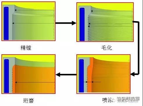 通過(guò)與國(guó)外噴涂廠家的交流,我們?cè)囍屏藝娡扛左w,掌握了等離子噴涂的工藝流程:缸孔精鏜—缸孔毛化—清洗—缸孔噴涂—過(guò)噴涂處理—最終珩磨。在此,對(duì)噴涂工藝的關(guān)鍵工序(見(jiàn)圖2)展開(kāi)分析。