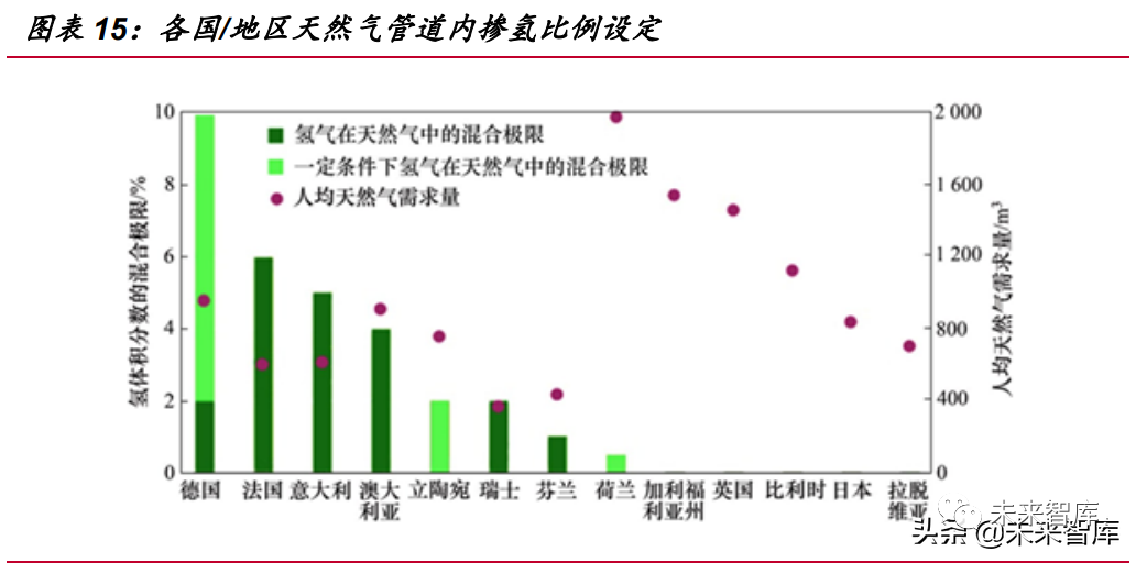 氫能產(chǎn)業(yè)發(fā)展初期階段,管道氫可由天然氣管道摻氫來(lái)實(shí)現(xiàn)過(guò)渡。由于純氫管 道的初始投資較大,不適合作為氫能發(fā)展初期應(yīng)用,在管道運(yùn)輸發(fā)展初期,可以積極 探索摻氫天然氣方式,即利用已建設(shè)的天然氣輸配管網(wǎng)與基礎(chǔ)設(shè)施進(jìn)行天然氣和氫氣 混合輸送,也可經(jīng)改造后輸送純氫,可實(shí)現(xiàn)低成本、規(guī)?;?、連續(xù)性氫能供應(yīng)。研究 結(jié)果表明,在含量較低時(shí)(10-20%摻氫比例),氫氣可以在不做重大技術(shù)調(diào)整的情況 下?lián)交熘撂烊粴?。未?lái)大力發(fā)展天然氣摻氫管道輸送技術(shù),關(guān)鍵需要解決管材、調(diào)壓 站、流量計(jì)、探測(cè)器等配套裝備的摻氫相容性與適應(yīng)性并完善管網(wǎng)安全運(yùn)行保障技術(shù)。 天然氣摻氫管道輸送技術(shù)是目前進(jìn)行大規(guī)模、長(zhǎng)距離氫氣輸送最為有效手段之一。