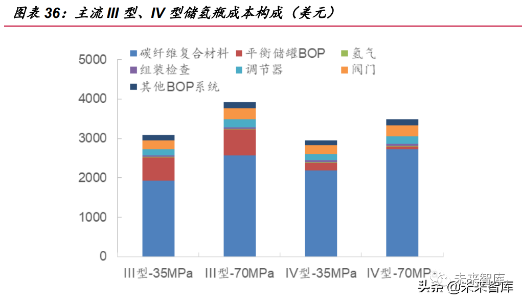 根據(jù)DOE及中科院寧波材料所測(cè)算,對(duì)于儲(chǔ)氫質(zhì)量均為5.6kg的35MPa、70MPa 高壓儲(chǔ)氫 III 型、IV 型瓶成本組成來(lái)看,主要成本貢獻(xiàn)者是碳纖維復(fù)合材料,均占到 總成本的 70%左右水平。此外,當(dāng) III 型及 IV 型瓶?jī)?chǔ)氫壓力增至 70MPa 時(shí),碳纖維 復(fù)合材料應(yīng)用成本及比例大幅提升。因此降低碳纖維應(yīng)用成本是儲(chǔ)氫瓶降本的關(guān)鍵。