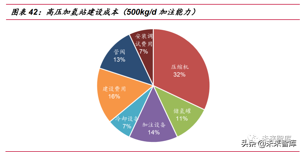 在當(dāng)前以高壓氣態(tài)實(shí)現(xiàn)氫儲(chǔ)運(yùn)的氫能發(fā)展初級(jí)階段,氫氣壓縮機(jī)是我國(guó)氫能儲(chǔ)運(yùn) 所需的關(guān)鍵設(shè)備,當(dāng)前國(guó)內(nèi)大多數(shù)氫氣壓縮機(jī)主要依靠進(jìn)口,投入及維護(hù)成本高,尤 其以加氫站所需壓縮機(jī),以 500kg/d 加注能力加氫站建設(shè)為例,壓縮機(jī)成本占據(jù)加氫 站總成本的三分之一。